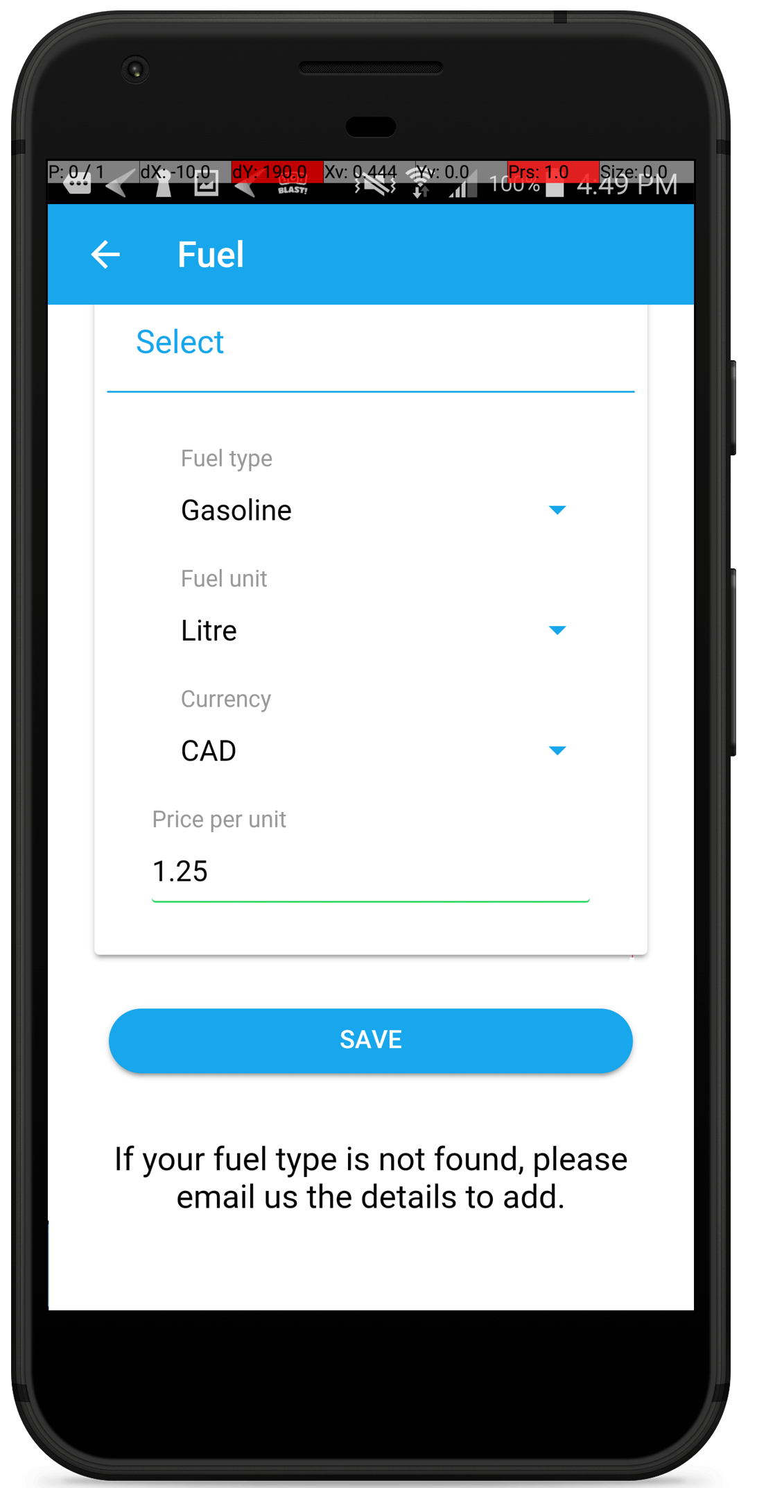 Enter fuel type, metric, exact price and choose desired currenty.